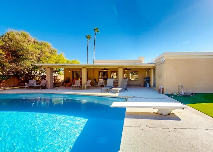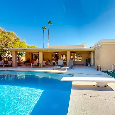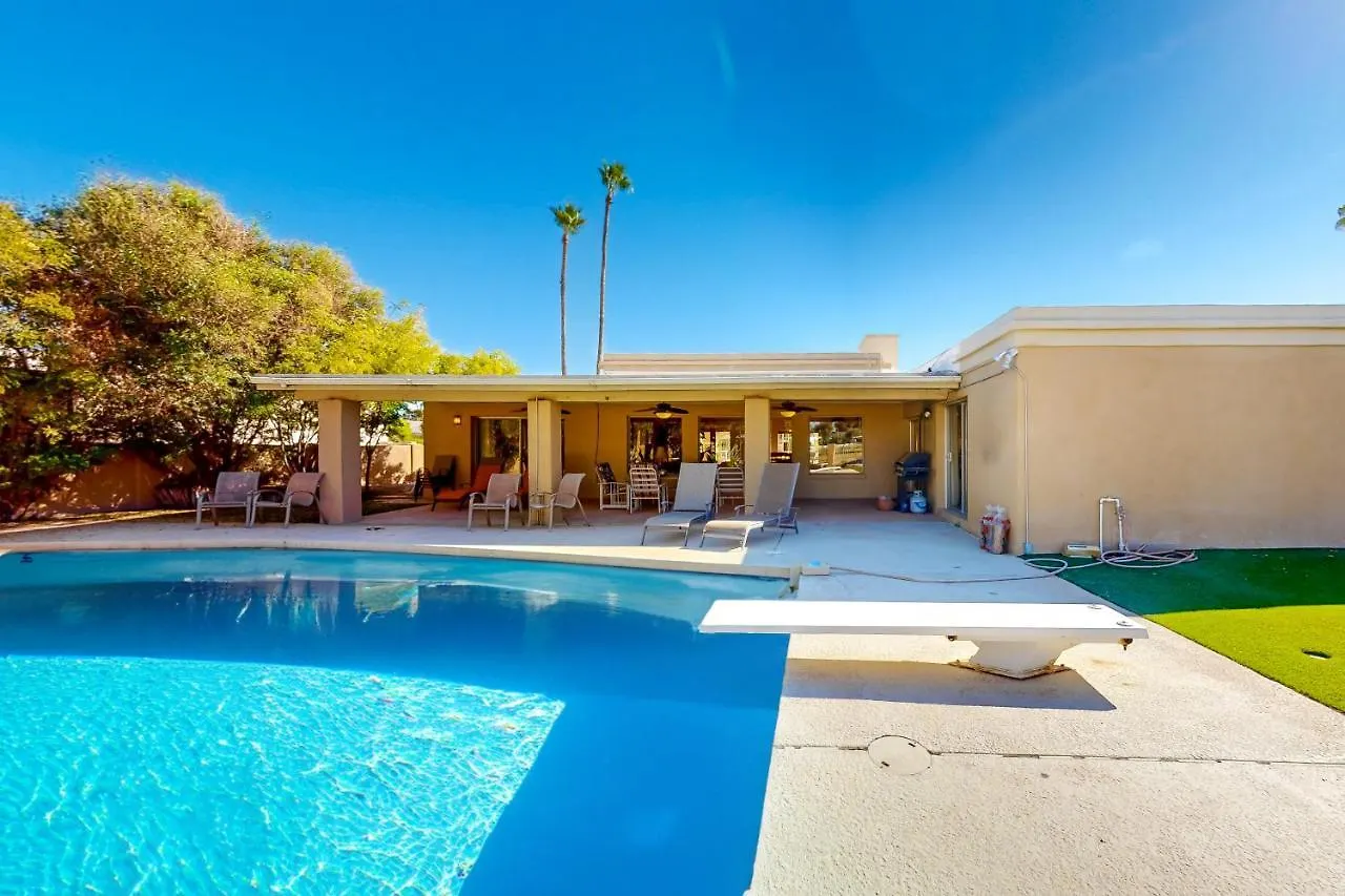 Guests are welcome to cook their own meals in an equipped kitchen or dine in an outdoor dining area. There is also a fridge, oven, and a kitchenware available in the kitchen. Phoenix Sky Harbor International airport is located 19 miles from the 3-bathroom villa.